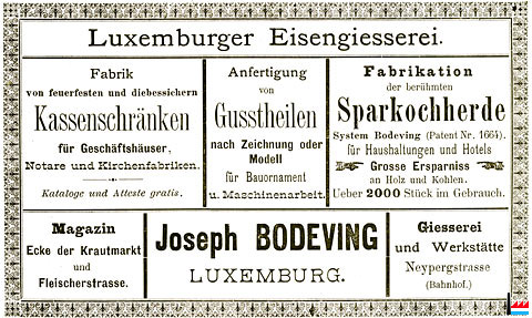 | 1900 | La fabrique de coffres-forts et de cuisinières économiques Jos. Bodeving, à Luxembourg-gare,