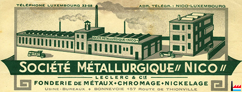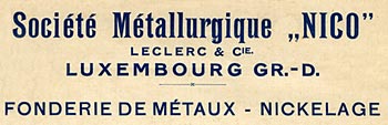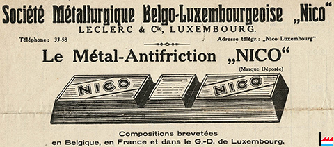 | 1926 | ![]() Société Métallurgique Belgo-Luxembourgeoise Nico (Collection: industrie.lu) Leclerc & Cie, Luxembourg Métal-antifriction Nico, compostions brevetées en Belgique, en France et au G.-D. de Luxembourg |