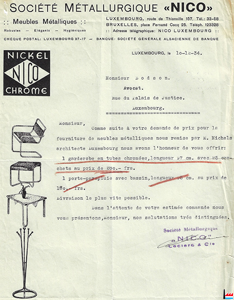 Spécialité : MÉTAL ANTIFRICTION « NICO » Téléphone Luxembourg N° 33-58 Papier à lettre à en-tête (Collection Aschman-Bodson) Facture 25/1679 du 31.1.1935 adressée à Monsieur Bodson, avocat. |