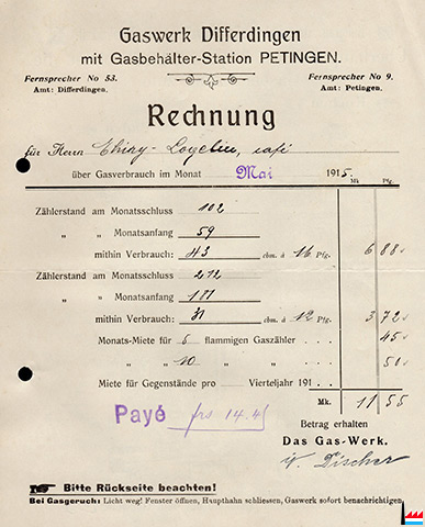 Rechnung Mai 1915 vom Gaswerk Differdingen mit Gasbehälter - Station Petingen (Collection: industrie.lu)