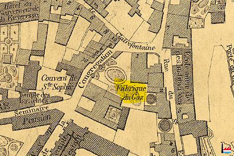 | 1862 | ![]() Fabrique du gaz, Luxembourg - rue du St. Esprit - 1862 (Extrait du Plan de la Ville et de la Forteresse de Luxembourg, dressé par J.B. Liesch, vérificateur-chef de bureau du Cadastre) |