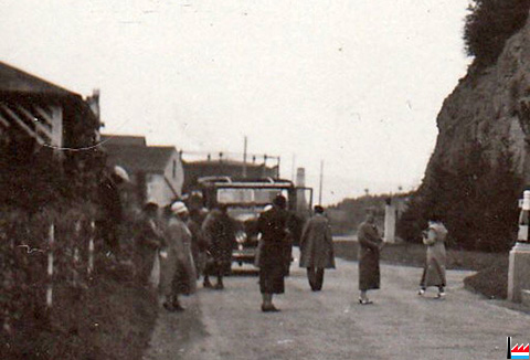Foto déi um Site vun Caves St. Martin gemaach gouf (Richtung Remich) am Hannergrond eppes gesinn wat en Gasometer vum Gaswierk vun Réimech kéint sinn. D’Gebai vum eemolegen Gaswierk grenzt jo direkt un d’Caves St. Martin. (Photo collection: André Bremer)