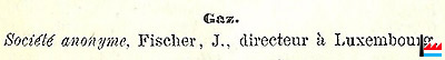 Gaz. - Société anonyme, Fischer, J., directeur à Luxembourg (Source: Almanach du Commerce du Grand-Duché de Luxembourg par N.C., 1re année, 1857, Luxembourg, Heintzé Frères, Libraires-Éditeurs; page 28; Collection: famille Aschman-Bodson) |