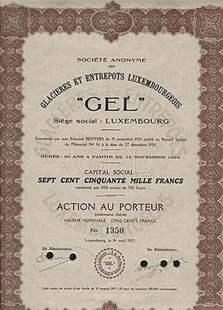 | 1932 | Versteigerung der Eisfabrik GEL, Differdingen (früher zu Luxemburg, jetzt Niederkorn) 11 mit Kork isolierte Gefrierungsräume |