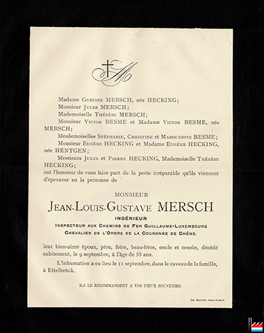 ![]() Décès de Jean-Louis-Gustave Mersch, ingénieur, à l'âge de 55 ans (à Dommeldange?) (Collection: industrie.lu) inspecteur aux chemins de fer Guillaume-Luxembourg |