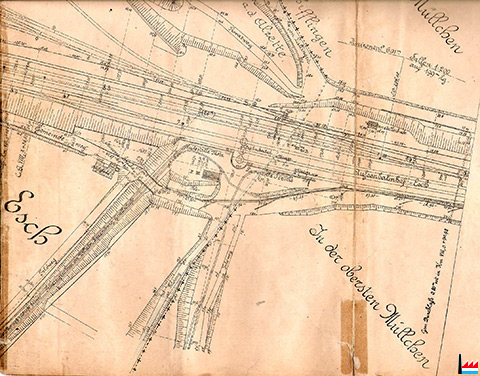 Aussenbahnhof Esch: Links die die Ladestelle (Quai) und Seilbetrieb (Schiefe Ebene / Plan incliné - Privateigentum der Wilhelm Luxemburg Gesellschaft ) der Grube Lallingerberg von Metz & Cie, rechts die Ladestelle (Quai) und Seilebene (Plan incliné) der Grube Lallingerberg der Servais & Cie - 3 Drehscheiben + 2 Waagen (Plan: um 1890 Marcel Schlim)