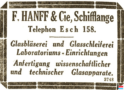 | Le 15 septembre 1919, Monsieur François-Ferdinand Hanff, ingénieur-chimiste, et Monsieur Joseph Hanff, pharmacien, créent la société « F. Hanff & Cie » basée à Schifflange. L’objet de la société est la fabrication et la vente de produits chimiques, industriels et pharmaceutiques de tous genres ainsi que la fabrication de tout genre de verreries pour laboratoires. | |||