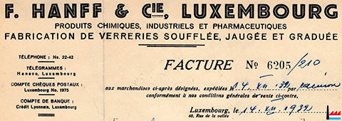 F. Hanff & Cie, Luxembourg - Produits chimiques, industriels et pharmaceutiques - Fabrication de verreries soufflée, jugée et graduée - facture de 1932