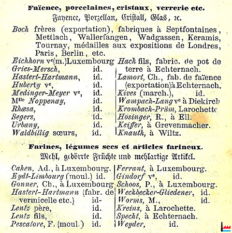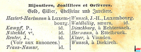(Source: Almanach du Commerce du Grand-Duché de Luxembourg par N.C., 1re année, 1857, Luxembourg, Heintzé Frères, Libraires-Éditeurs, page 27; Collection: famille Aschman-Bodson)