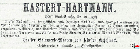 | 1857 | Hastert - Hartmann : Faïence, porcelaines, cristaux, verreries, etc. - Farines, légumes secs et articles farineux (fabricant de vermicelle etc.) - Fleurs artificielles - Confiseur - Bijoutiers, joailliers et orfèvres - 1857. |