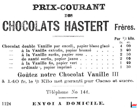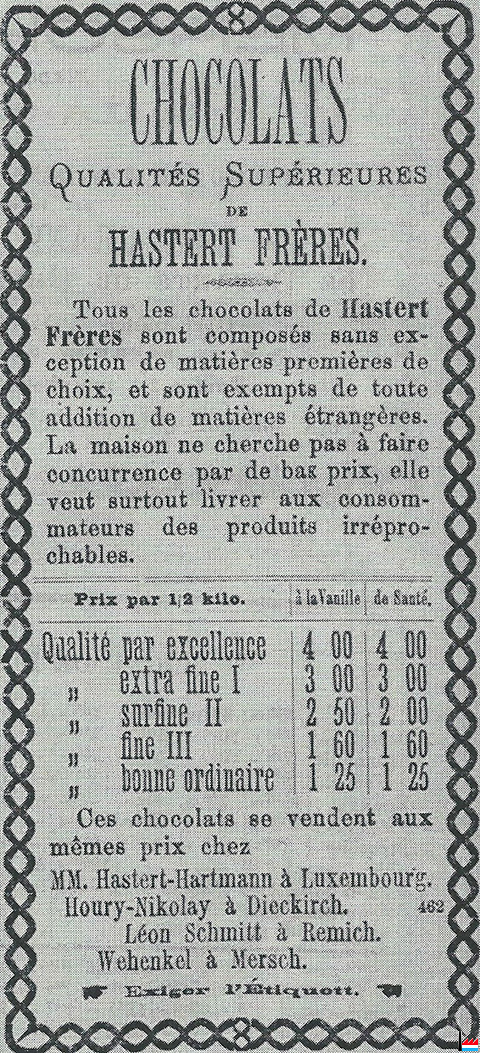 Tous les chocolats de Hastert Frères sont composés sans exception de matières premières de choix, et sont exempts de toute addition de matières étrangères. La maison ne cherche pas à faire concurrence par le bas prix, elle veut surtout livrer aux consommateurs des produits irréprochables. (…) Ces chocolats se vendent aux mêmes prix chez MM. Hastert-Hartmann à Luxembourg, Houry-Nikolay à Diekirch, Léon Schmitt à Remich, Wehenkel à Merch. - Exiger l’Étiquette.