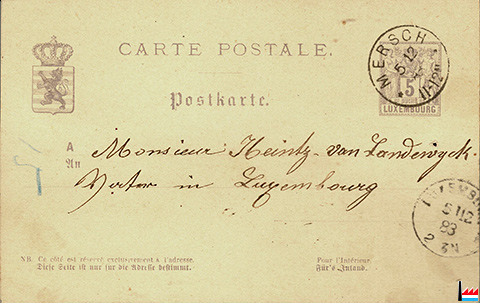 Wilwers, Mersch-Gare an Heintz - van Landewyck in Luxemburg - 5.12.1883 (Carte postale: collection: industrie.lu)