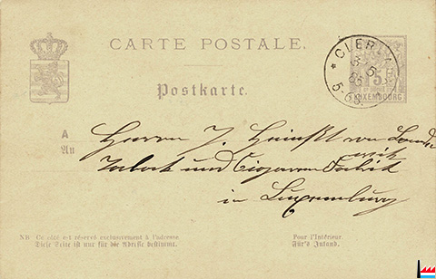 Herrn J. Heintz von Landewick Tabak- und Zigarrenfabrik in Luxemburg, 3.5.1885 - (Carte postale: collection: industrie.lu)