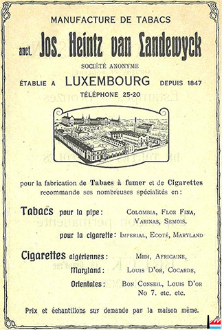 | 1911 | Fondation / Gründung: Manufacture de Tabacs Anct Jos. Heintz Van Landewyck Capital: 1.500.000 LUF |