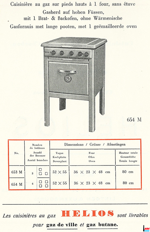 1955 - HÉLIOS - Cuisinière au gaz sur pieds hauts à 1 four, sans étuve - 653 M et 654 M | 1955 | ||