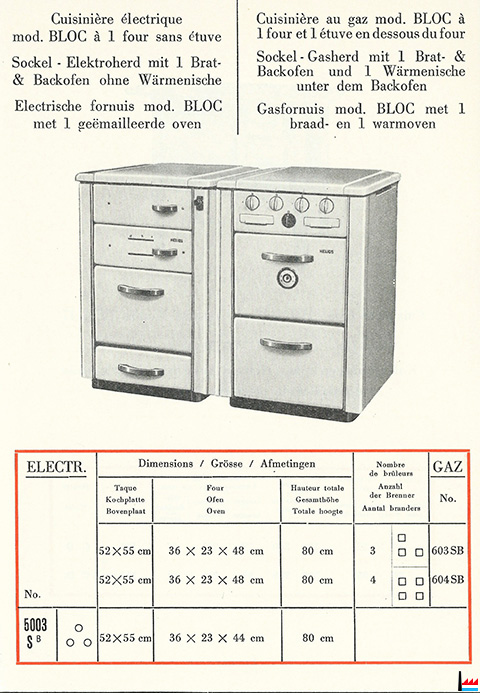 1955 - HÉLIOS - Cuisinière électrique mod. BLOC à 1 four sans étuve - 5003 SB - Dans: "Luxembourg - Au service du Congo" - Publié par le Service d’expansion économique avec la collaboration de la Fédération des industriels, 1955, Imprimerie Bourg-Bourger, Luxembourg (Collection Charles-Louis Aschman)