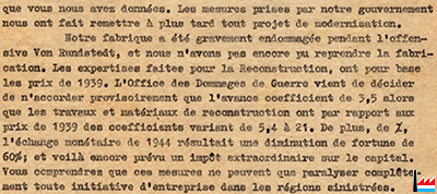 ![]() Les mesures prises par notre gouvernement nous ont fait remettre à plus tard tout projet de modernisation. Extrait d'une lettre de Selm, Echternach du 25.3.1946 aux Etablissements RENOU, Roanne (Collection: industrie.lu) |