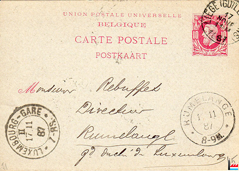 Carte postale de M. Hoffmann - Bettendorf, Liège à Monsieur Rebuffet, Directeur, Rumelange - 17.11.1887