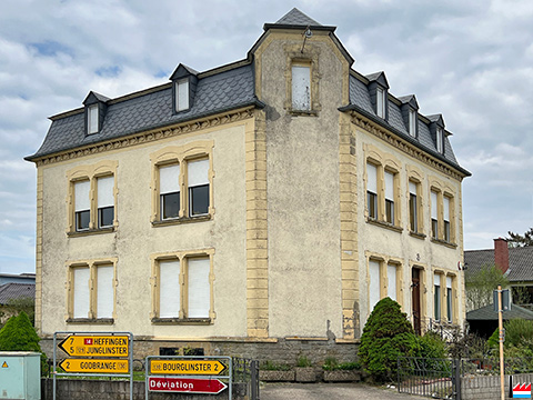 Als Café de la Station und zugleich als Stationsgebäude Altlinster vorgesehen (Photo: 5.5.2022 jmo) Eck Schleifmillen / CR130: www.google.com/maps/@49.7220883,6.2179655,3a,63.2y,75.64h,90.74t/data=!3m6!1e1!3m4!1sNGjBPd7cth8zG8Fl3gJ3kQ!2e0!7i13312!8i6656