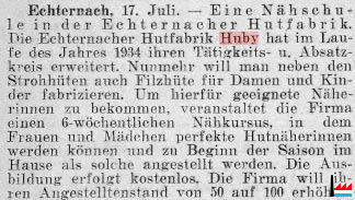 | 14.3.1932 | Das Anwesen "Hutfabrik Gebrüder Huby, Echternach" (begreifend 2 Wohnhäuser, Atelier, Remise, Hofraum und Garten, alles in einem Bering) der Gebrüder Huby und Erben Jules Huby ging in öffentlicher Versteigerung zum Preise von 300.000 Fr an die Familie Huby zurück. (LW: 15.3.1932) |