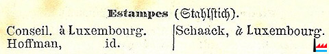 Estampes - Stahlstich - 1857 (Conseil, Hoffman, Schaack, à Luxembourg) - (Source: Almanach du Commerce du Grand-Duché de Luxembourg par N.C., 1re année, 1857, Luxembourg, Heintzé Frères, Libraires-Éditeurs; page 27 - Collection: famille Aschman-Bodson)
