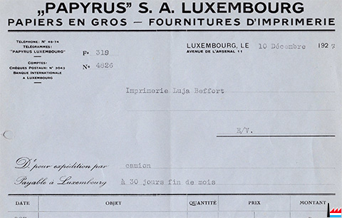 Papyrus S.A. Luxembourg, 11 avenue de l'Arsenal, Luxembourg - facture: 1927 (Collection: Yves Kemp)