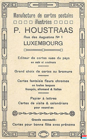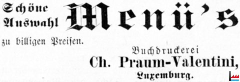 | 1893, 1896 | ![]() Buchdruckerei Ch. Praum-Valentini, Luxembourg, 11 rue de la Boucherie (De Letzeburger: 29.2.1896) |