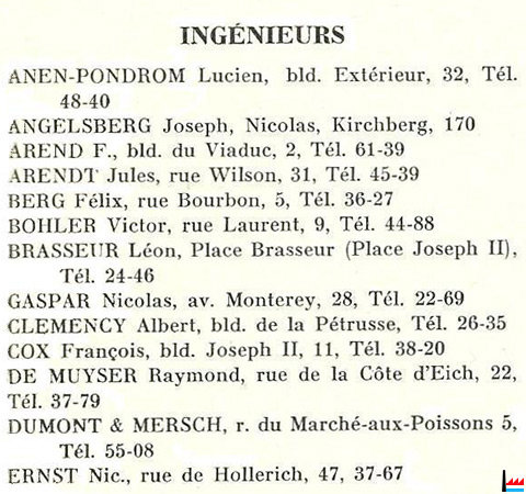 | 1942 | Schmit Josef, Ingenieur, Schifflinger Straße 28, Esch Raters Franz, Dipl. Ing., Wilhelmallee 39, Luxemburg Ruppert Eugen, Ing. Runder Platz 2, Limpertsberg |