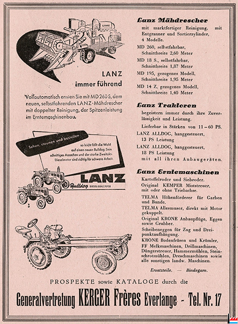 | 1957 | ![]() Kerger frères Generalvertretung von Lanz-Traktoren (Publicité de 1957; collection: industrie.lu) |