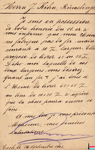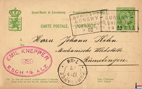 Postkarte von Emil Knepper, Esch/Alzette an Johann Kihn, Mechanische Werkstätte, Rümelingen - 16.9.1902