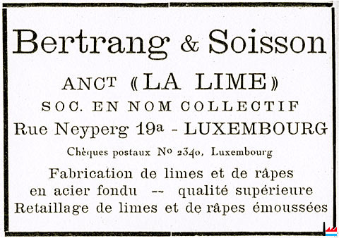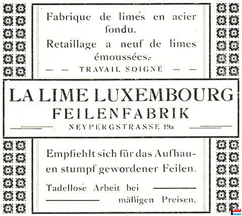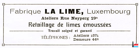 ![]() La Lime Luxembourg - Feilenfabrik - 1922 (Publicité - Collection: industrie.lu) |