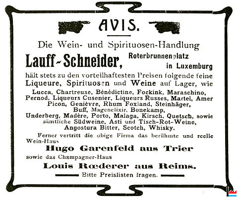 | <=1910 | Lauff-Schneider, Luxembourg Vins, spiritueux et liqueurs - Exploitant : Frederic Lauff, Luxembourg. (Registre aux firmes N° 58 - Du 11 mars 1910) |