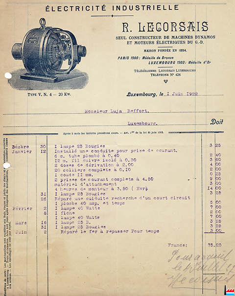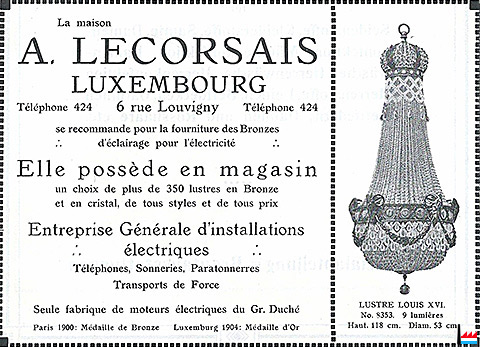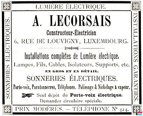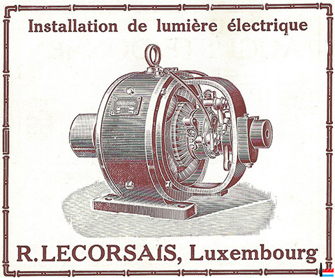 | 1910 | Electricité industrielle, A. Lecorsais, Luxembourg Exploitant : Ad. Lecorsais. Luxembourg |