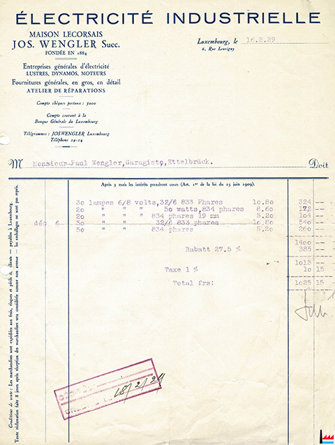| <=1929 | ![]() Electricité Industrielle, Jos. Wengler succ., Maison Lecorsais - fondée en 1884, tél: 2424 (Collection: industrie.lu) |