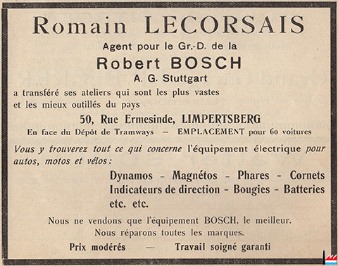 | <=1938 | Romain Lecorsais - Luxembourg, 50 rue Ermesinde, Limpertsberg Generalvertreter der Robert Bosch A.G., Stuttgart |