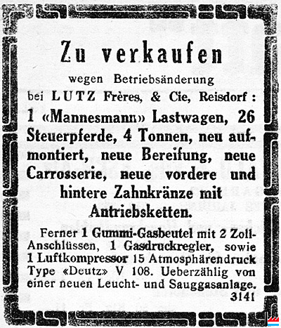 | 2.1920 | Zu kaufen gesucht 3 bis 4 amerikanische Heereswagen. Offerten sind zu richten an Lutz frères, Platrières. Reisdorf. (LW: 19.2.1920) |