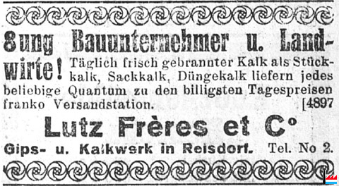 | 4.1928 | Lutz Frères et Co Gips- und Kalkwerk in Reisdorf Täglich frisch gebrannter Kalk als Stückkalk, Sackkalk, Düngekalk (LW: 6.4.1928) |