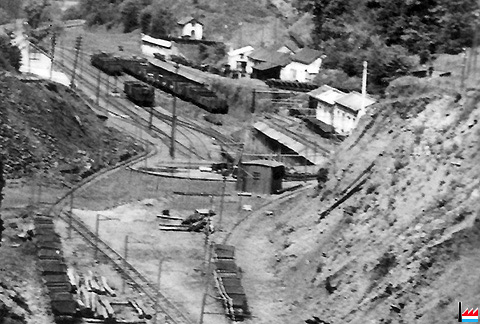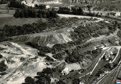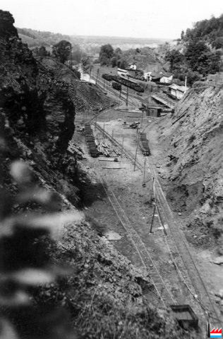 Galerie, genau hannert dem Zementswierk vun Remeleng. Déi Galerie soll schon 90 Joër äusser Betrieb gewiecht sin an komesch ass et gêtt op der ganzer Streck (4 km), keng èng Ofstéip (Foto: 1990 Remo Raffaelli)