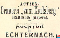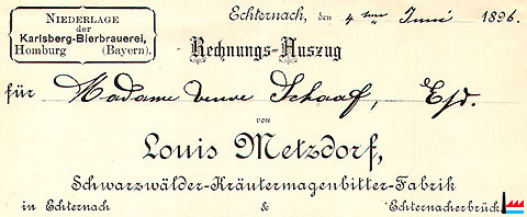 | 1896 | METZDORF Louis, Marchand de bière - Echternach, Fabrique d'eaux gazeuses Niederlage der Karlsberg-Bierbrauerei, Homburg (Saarpfalz damals Bayern) Echternach & Echternacherbrück |