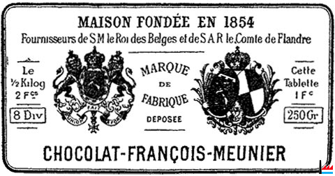 Grande-Armée, à Paris. 1° L'étiquette rectangulaire en papier blanc s'appliquant sur le papier d'enveloppe jaune des tablettes comportant la dénomination « Chocolat- François - Meunier », avec mention variable quant au prix et au nombre des divisions; au milieu se trouvent les mots : « Marque de fabrique déposée » sur quatre lignes; des deux côté» les armoiries du Roi des Belges et du Comte de Flandre ; en haut sur deux lignes les mots ; « Maison fondée en 1854, Fournisseurs de S. M. le Roi des Belges et de S. A. R. le comte de Flandre». 2° Deux bandes rectangulaires portant « Chocolat-François-Meunier» et s'appliquant de côté sur l'enveloppe jaune. Cette marque est employée dans des dimensions et couleurs variées, sur les paquets de chocolats fabriqués par Meunier frères. |