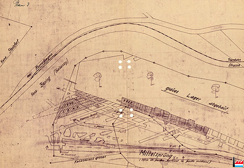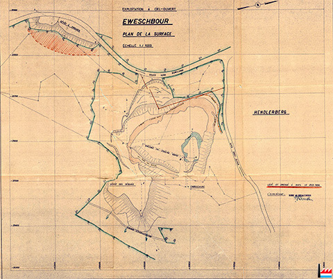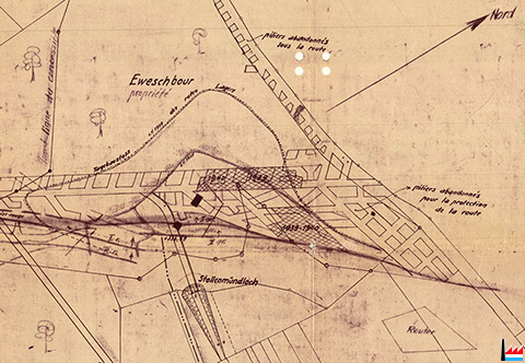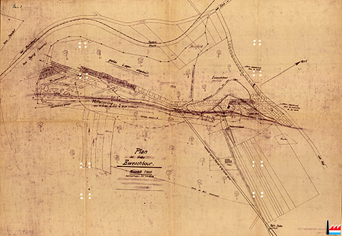 Eweschbour : Konzession Steinfort , Konzession Besing (Halanzy), travers-bancs, couche grise, couche jaune, couche rouge, ligne du concessible - Konzessionsgrenze, essai de traverser, Mittelsprung, séries de failles formant la faille médiane, graues Lager abgebaut, Trambahn TICE, concession 1904, Sterzfeld, puits grise - rouge, Tagebaustoss des roten Lagers 1.4.1939, embouchure / Stollenmundloch, piliers abandonnés sous la route, ancienne galerie à la couche grise - Tiefer Stollen + 316,65, Linster, Reuter - Plan der Grube Eweschbour 1940 (Scan: Jeannot Lunkes)