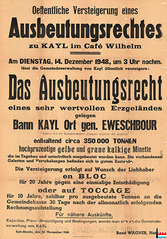 Ausbeutungsrecht des Erzgeländes Eweschbour enthaltend circa 350.000 Tonnen hochprozentige gelbe und graue kalkige Minette Versteigerung en Bloc für 20 Jahre gegen eine einmalige Entschädigung oder auf Toccage für 10 Jahre, zahlbar pro ausgebeutete Tonnen an die Gemeindekasse (Scan: Jeannot Lunkes) |