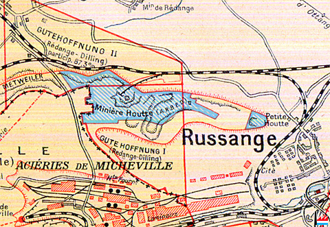 Minière Houtte (ARBED) - Petite Houtte - Metweiler, Russange - Rüssingen - Mine GuteHoffnung I + II, Aciéries de Micheville (Carte collection: jmo - Google Earth 2012)
