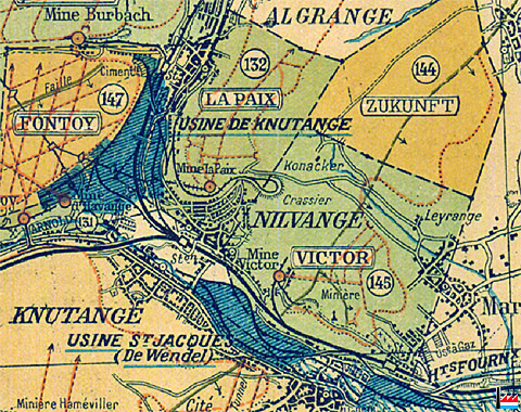 entre les concessions / mines: Zukunft, Victor, De Wendel, Fontoy - Usine de Knutange