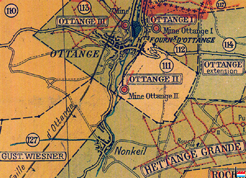 entre les concessions / mines: Ottange I, Ottange extension, Hettange-Grande, Gust. Wiesner, Ottange III