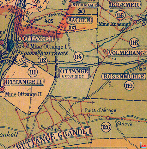 entre les concessions / mines: Aachen (117) - Kraemer (115) - Rosenmühle (119) - Hettange-Grande (126) - Ottange II (111) - Ottange I (112)