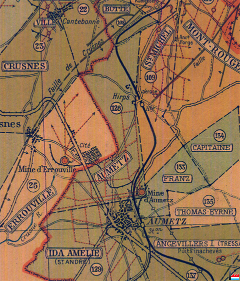 entre les concessions / mines: Villerupt (22) - Butte (108) - St. Michel (109) - Franz (133) - Ida Amélie (129) - Errouville (25) - Crusnes (23)