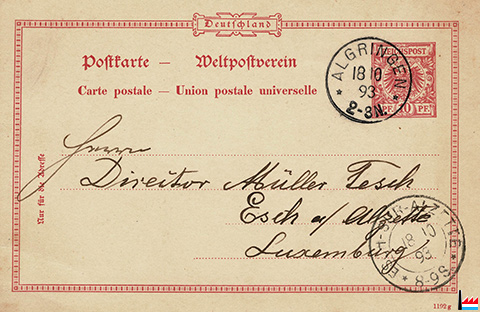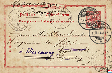 ![]() Diedenhofen 11.5.1894 an ![]() Müller-Tesch, Ingenieur der Hochöfen, Esch/Alzette - 11.5.1894 (Collection: industrie.lu) à Messancy |