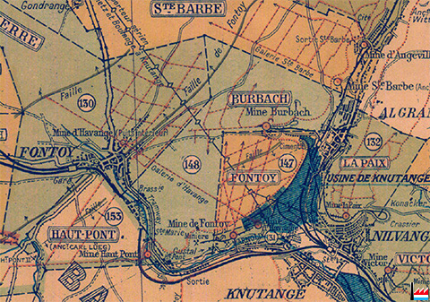 entre les concessions / mines Ste Barbe, La Paix, Fontoy, De Wendel, Haut-Pont, Havange