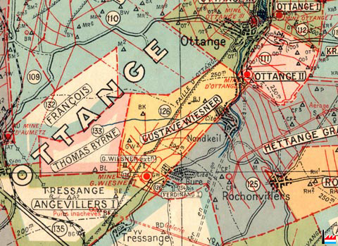 entre les concessions / mines: Mont-Rouge (110) - Ottange III (113) - Ottange II (111) - Hettange-Grande (126) - Gust. Wiesner extension (127) - Thomas Byrne (135) (Carte Collection: industrie.lu)
